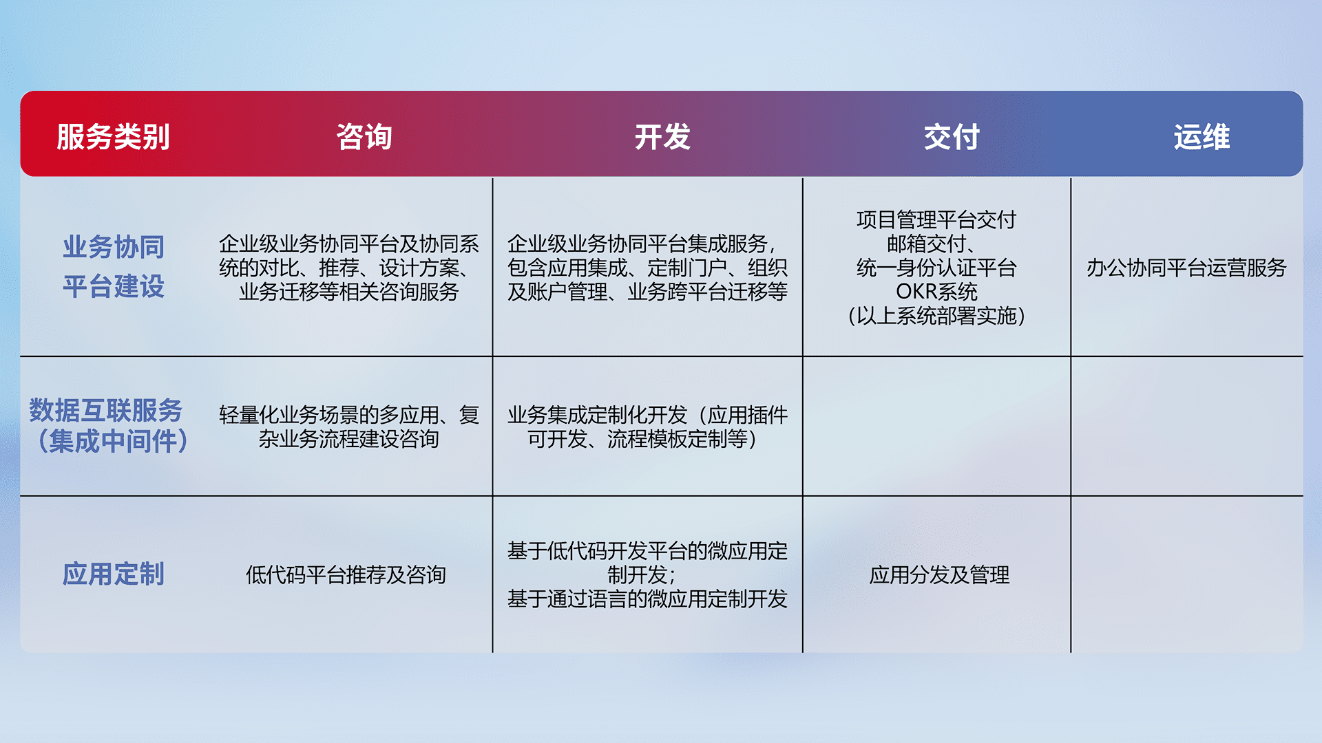 针对钉钉、、、企微、、、、IDaas等平台级产品提供产品的规划、、、、方案、、交付、、、、定制化开发等服务,,实现如统一协同办公、、智能客户服务、、混合会议管理、、、、智能数据查询、、等业务场景,,实现数字化转型。。